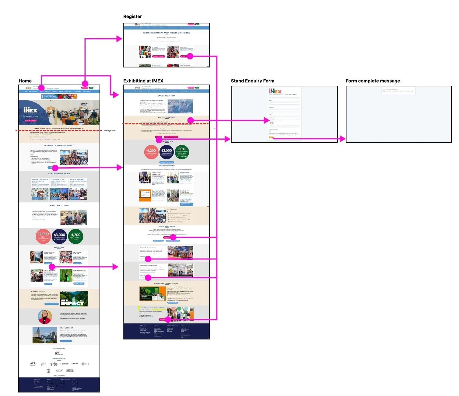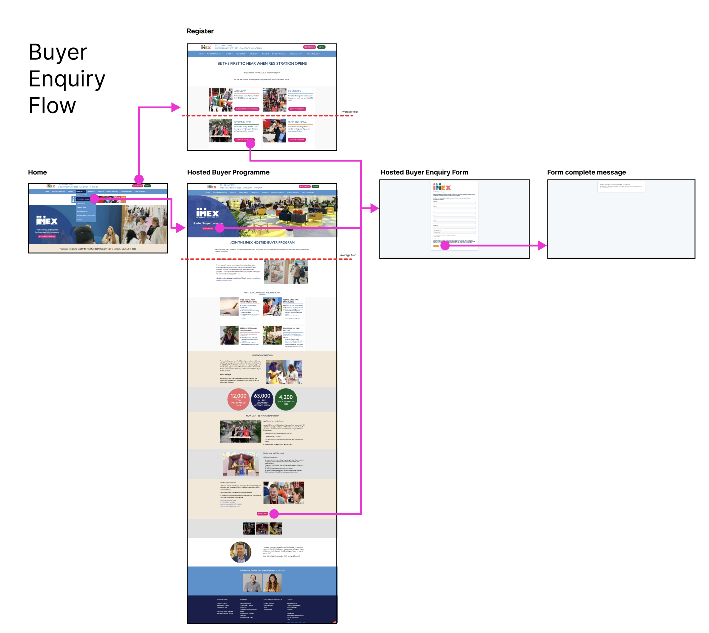 Data collection: Exhibition enquiry, buyer applications and newsletter signups opened as tabs with single page forms, this approach made the website conversion journey feel untrustworthy with GA data showing high drop off from page to form completion. To improve conversion analysis, build trust and provide users with expected web behavior, embedding these into the site, adding form completion links back to relevant areas of the site.