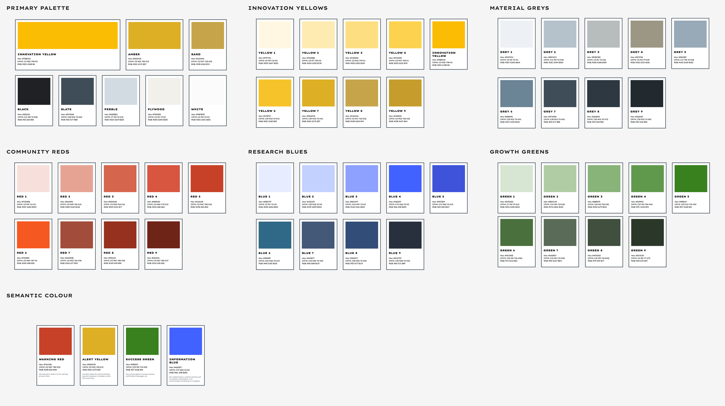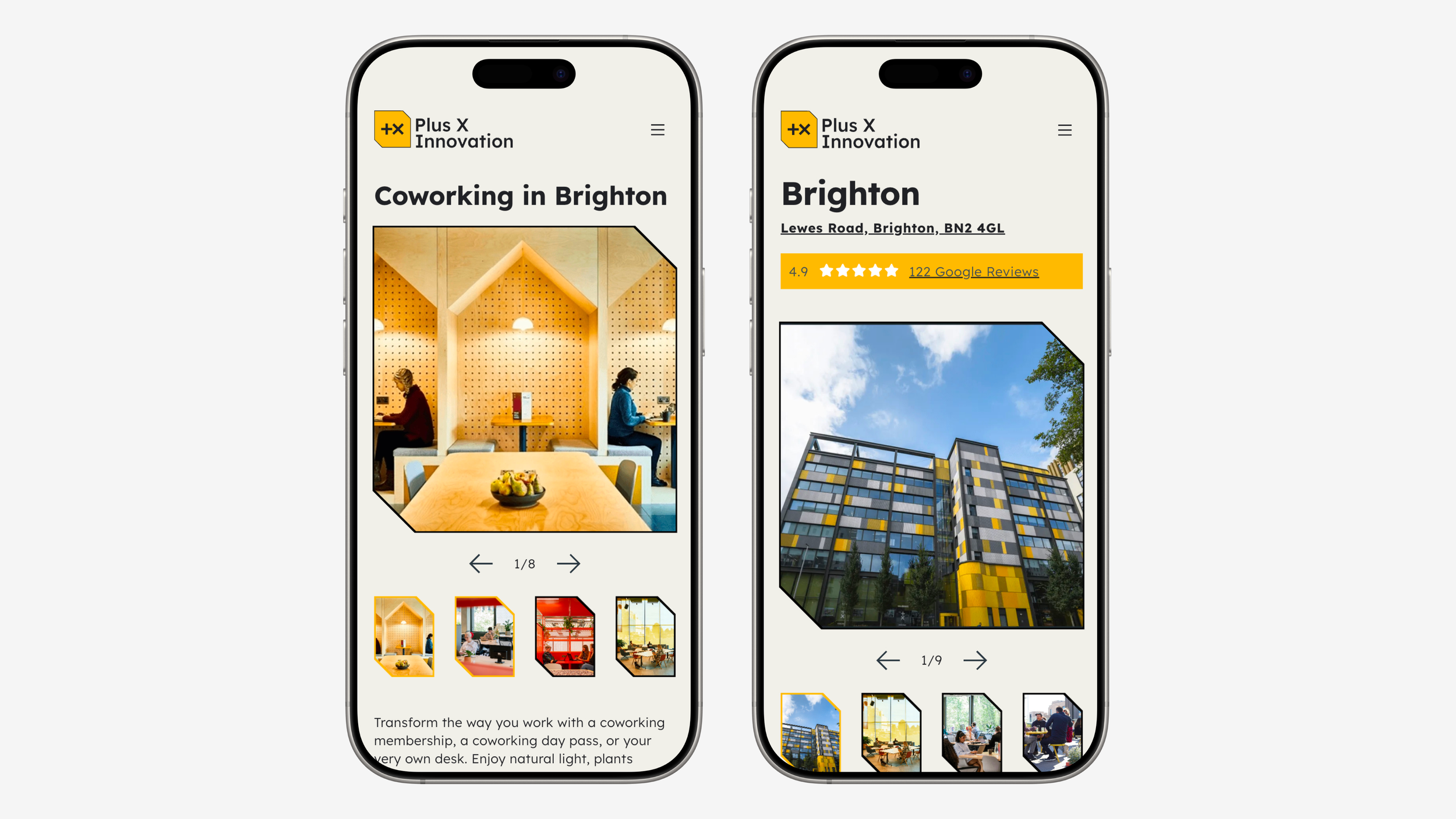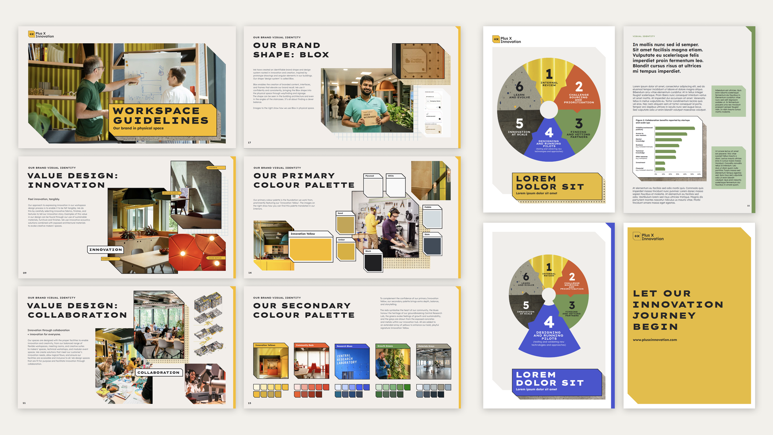 While the previous colour palette was quite varied, we honed in on what we see as Plus X Innovation’s most recognisable colour: yellow found prominently in physical space and innovation programmes.